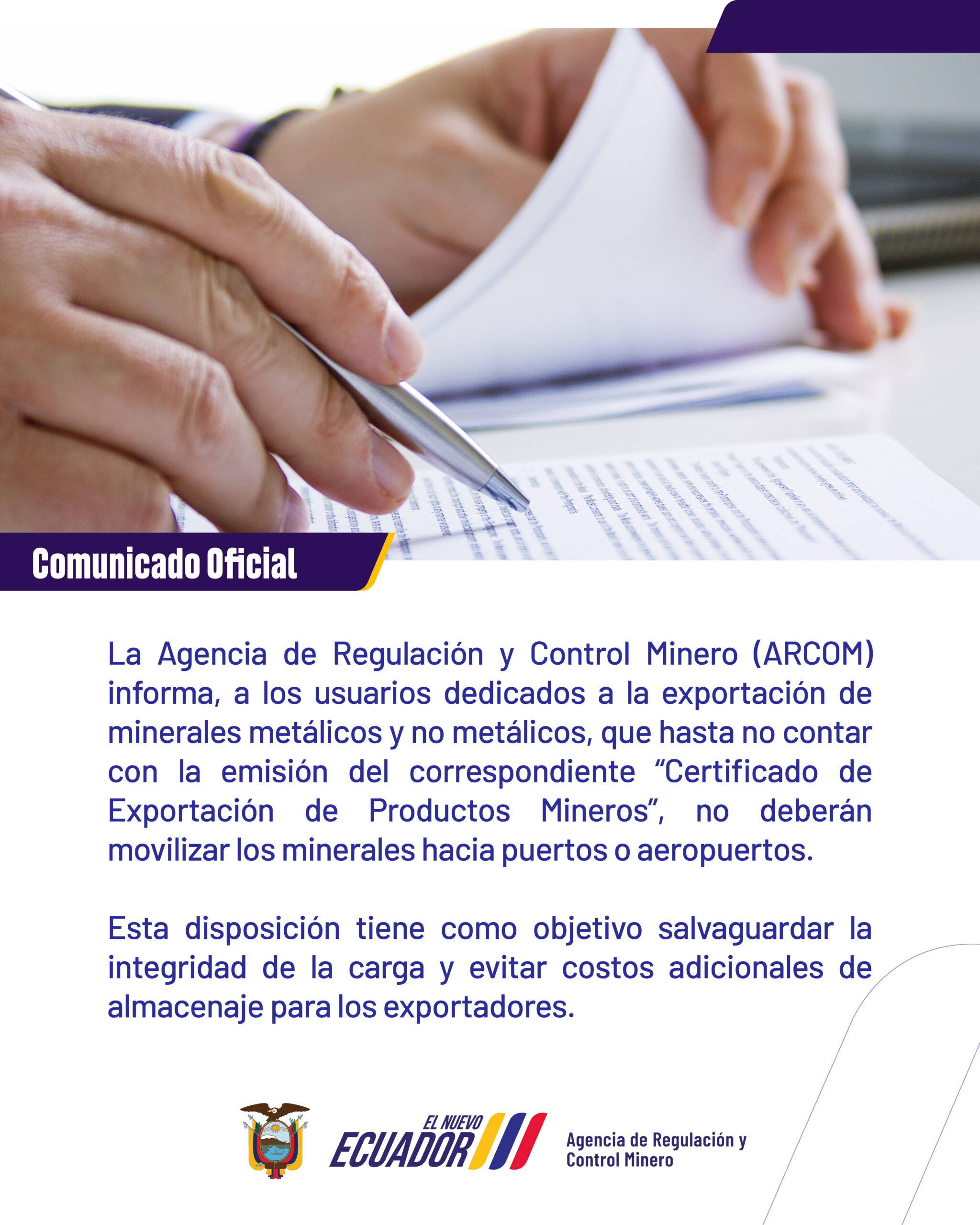 La Agencia de Regulación y Control Minero (ARCOM) informa a los usuarios dedicados a la exportación de minerales metálicos y no metálicos que, hasta no contar con la emisión del correspondiente “Certificado de Exportación de Productos Mineros”, no deberán movilizar los minerales hacia puertos o aeropuertos.